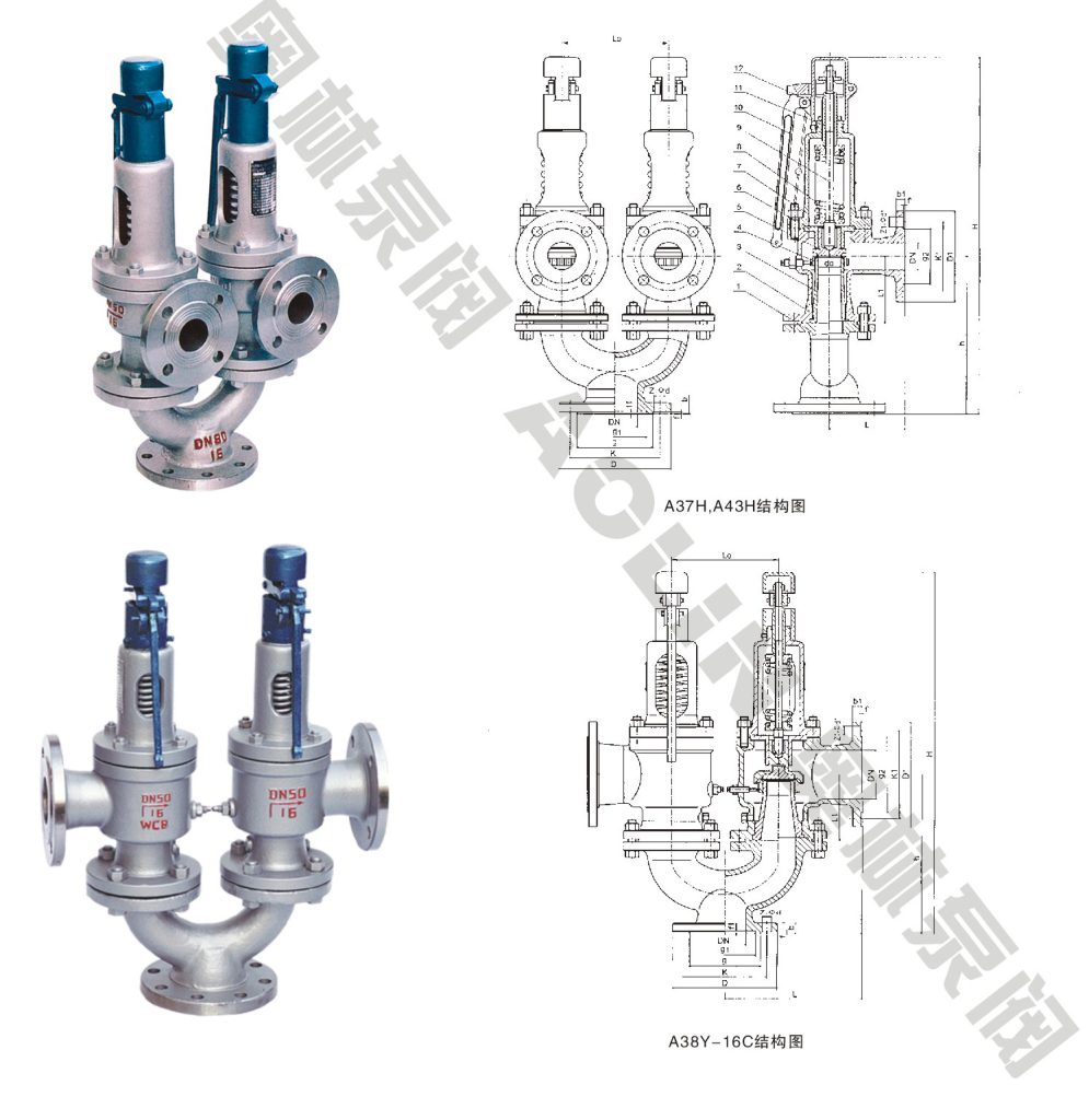 A38Y、A43H、A37H型安全閥除三通(材料為WCB)外,其余零件的材料均和A47H、A48Y型彈簧式安全閥相同